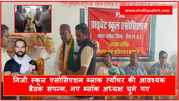 आज प्राइवेट स्कूल एसोसिएशन ब्लाक त्यौंथर जिला रीवा की आवश्यक बैठक के मुख्य अतिथि श्री आर. के. शर्मा जी जिला अध्यक्ष रीवा विशिष्ट अतिथि श्री सतीश तिवारी जी जिला उपाध्यक्ष रीवा, श्री संजय पटेल जी जिला महासचिव रीवा, श्री पंकज उपाध्याय जी विधिक सलाहकार रीवा। कार्यक्रम की अध्यक्षता श्री समर जीत सिंह ब्लाक अध्यक्ष त्यौंथर द्वारा की गई।
