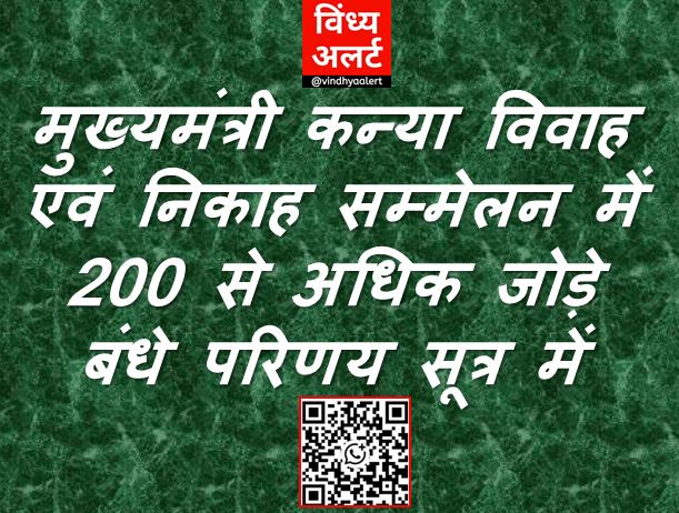 मऊगंज में आयोजित जिला स्तरीय सामूहिक विवाह, निकाह आयोजन में 200 से अधिक जोड़े परिणय सूत्र में बंधे। गरिमामय समारोह में जिले के विभिन्न क्षेत्र से आये जोड़ों ने वैदिक मंत्रोंच्चार और सामाजिक रीति रिवाज के साथ गृहस्थ जीवन में प्रवेश किया। शहीद केदारनाथ महाविद्यालय प्रांगण में आयोजित कार्यक्रम में जनप्रतिनिधियों सहित प्रशासनिक अधिकारियों ने नवदम्पत्तियों को शुभ आशीर्वाद दिया। उपस्थित जनों ने कहा कि गरीब लोगों के लिए यह योजना हितकारी है। अब बेटियों के विवाह की चिंता स्वयं सरकार करती है और जनप्रतिनिधियों सहित अधिकारी उपस्थित रह कर वर-वधू को आशीर्वाद देते हैं। इस अवसर पर जिला भाजपा अध्यक्ष डॉ. राजेन्द्र मिश्र, अध्यक्ष नगर परिषद मऊगंज बृजवासी पटेल, कलेक्टर संजय कुमार जैन, पुलिस अधीक्षक दिलीप सोनी, अध्यक्ष जनपद पंचायत नईगढ़ी ममता तिवारी सहित बड़ी संख्या में वर-वधू तथा उनके परिजन उपस्थित रहे।