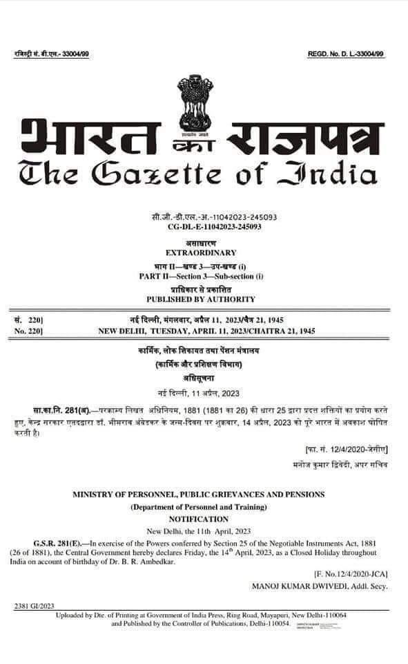 राज्य सरकार ने 14 अप्रैल 2023 डॉ. भीमराव अम्बेडकर जयंती के उपलक्ष्य में संपूर्ण मध्यप्रदेश में सार्वजनिक अवकाश घोषित किया है। इस आशय की अधिसूचना आज सामान्य प्रशासन विभाग द्वारा जारी की गई है।