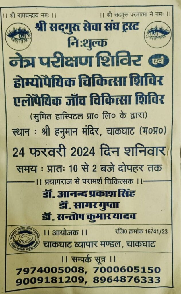 चाकघाट व्यापार मंडल चाकघाट के सौजन्य से श्री सदगुरु सेवा संघ ट्रस्ट जानकी कुंड चित्रकूट द्वारा लगातार चौथी बार निःशुल्क नेत्र परीक्षण शिविर एवम् निःशुल्क मोतियाबिंदु ऑपरेशन, बड़े हनुमान मंदिर चाकघाट में आगामी फरवरी 24, 2024 दिन शनिवार को सुबह 9:30 से दोपहर 2:00 बजे तक आयोजित किया जा रहा। साथ ही इस बार शिविर में निःशुल्क होम्योपैथिक चिकित्सा शिविर एवं एलोपैथिक जांच चिकित्सा शिविर (शुगर, बीपी की नि:शुल्क जांच) भी शामिल है। जिसमें प्रयागराज से होम्योपैथिक चिकित्सक डॉ. आनंद प्रकाश सिंह, डॉ. सागर गुप्ता, डॉ.संतोष कुमार यादव, सुमित अस्पताल आदि शामिल हैं। आपको बता दें शिविर में चिन्हित मोतियाबिंदु के मरीजों को शिविर के बाद निःशुल्क श्री सदगुरु सेवा संघ ट्रस्ट जानकी कुंड चित्रकूट के लिए रवाना किया जायेगा।