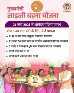 शासन द्वारा मुख्यमंत्री लाड़ली बहना योजना 5 मार्च से आरंभ की गई है। इस योजना के तहत 23 से 60 आयु वर्ग की विवाहित पात्र...